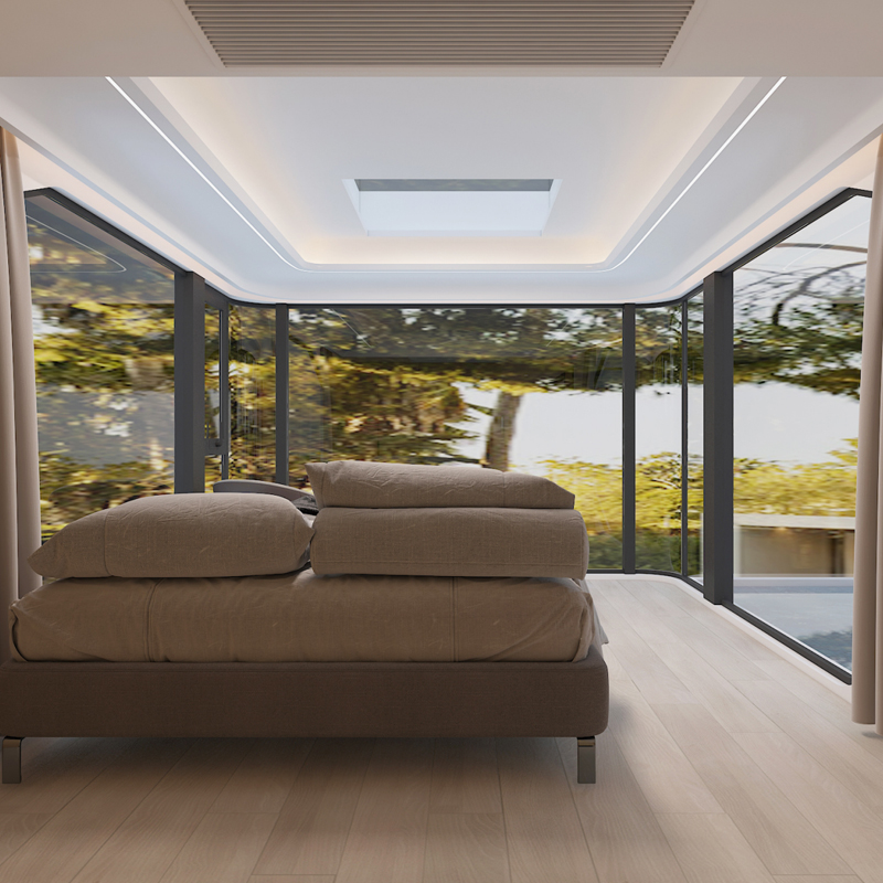 With its sleek aerodynamic silhouette and aerospace-grade aluminum frame, the A5+ looks like a vessel from the future resting on the shore. Panoramic glass walls, automatic shading, and smart climate control transform every moment — sunrise or starlight — into an immersive oceanfront experience.